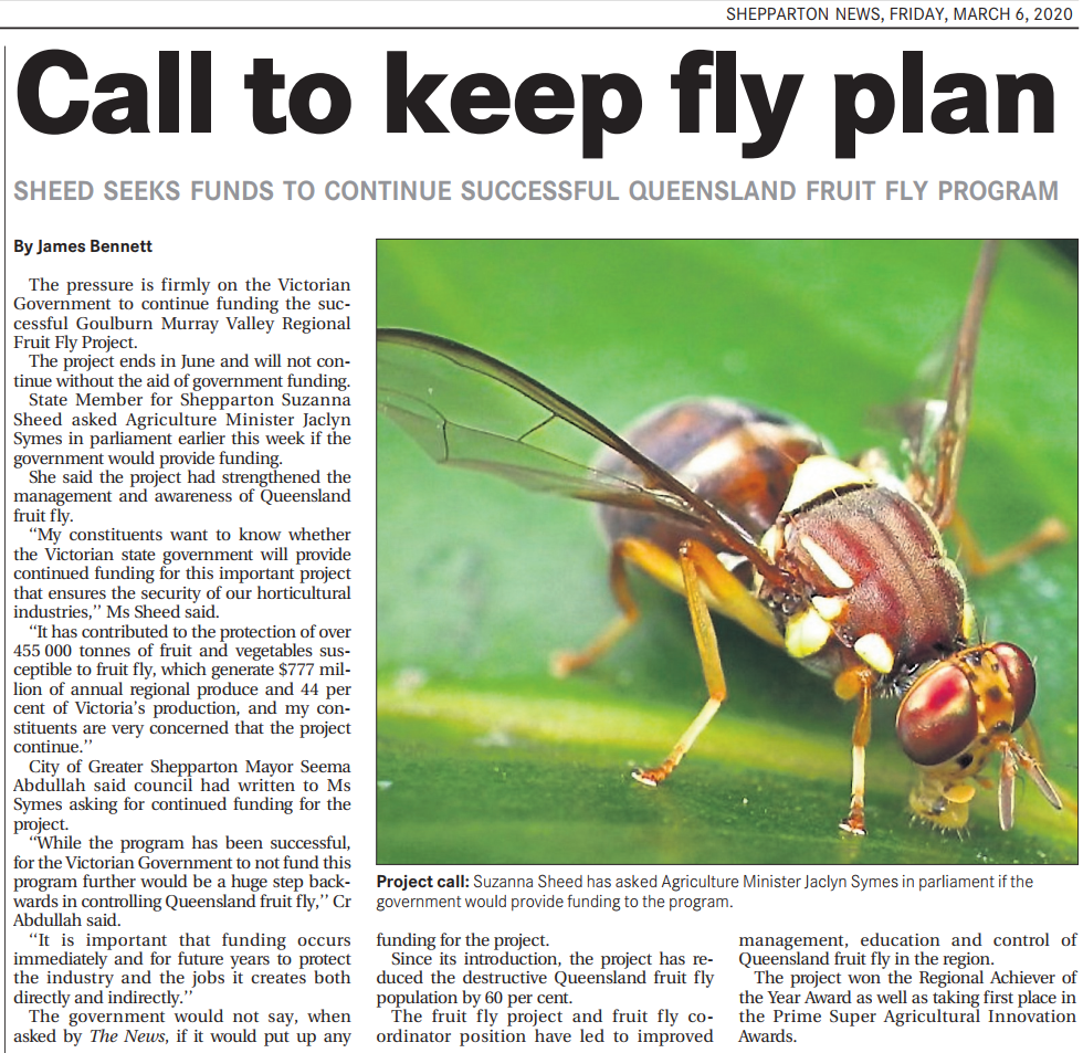 The No Flies On Us! website is managed by the The Goulburn Murray Valley (GMV) Regional Fruit Fly Group in order to strengthen fruit fly area wide management across the region. Its development has improved area wide coordination and allowed for effective collaboration between industry, government and the community.